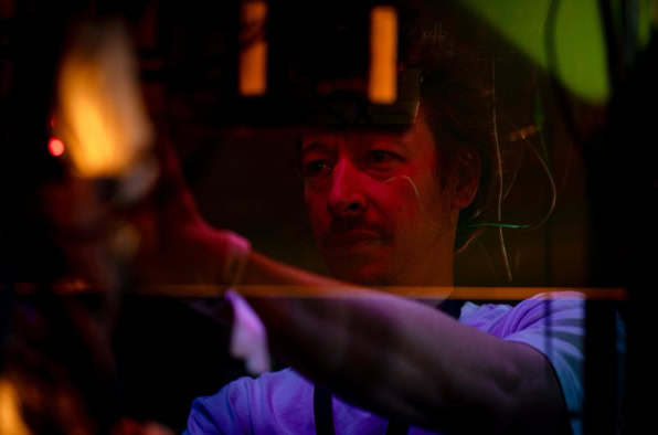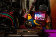 Man betritt diesen Ort – nicht richtig Bühne, nicht richtig Installation, eher so etwas wie der transparente Bauch eines Raumschiffs, neonbunt aus den 90er-Jahren. Plexiglas, Kabel, Magnetband. Die Maschine: ein widerspenstiger Block aus Nostalgie und Zukunft.