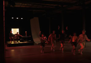 The performance relates to the story telling principle of "1001 night", where Scheherazade will be killed by the king if she does`nt continue to tell a story every night, where she promises that the next story will even be more exciting.