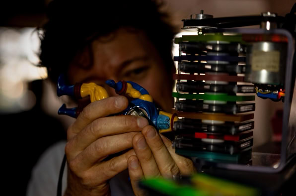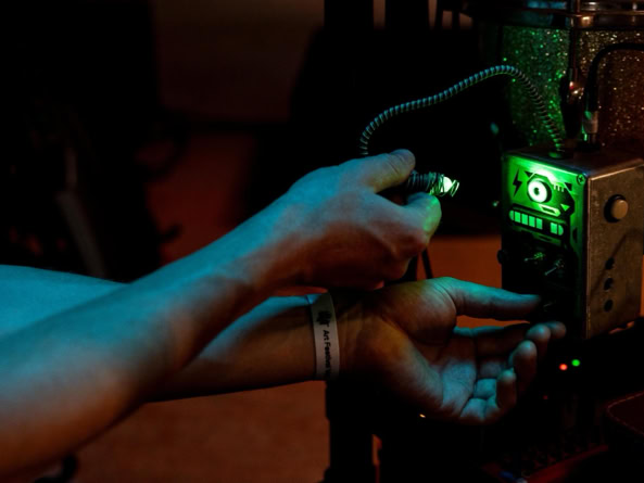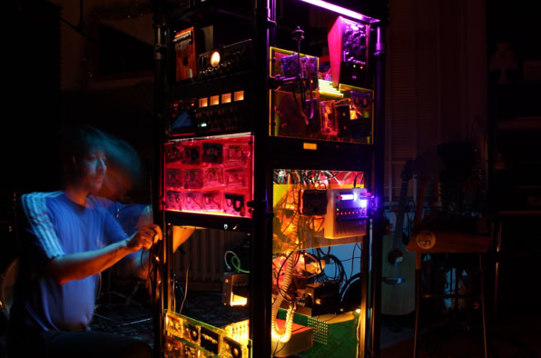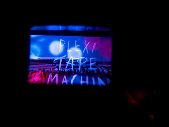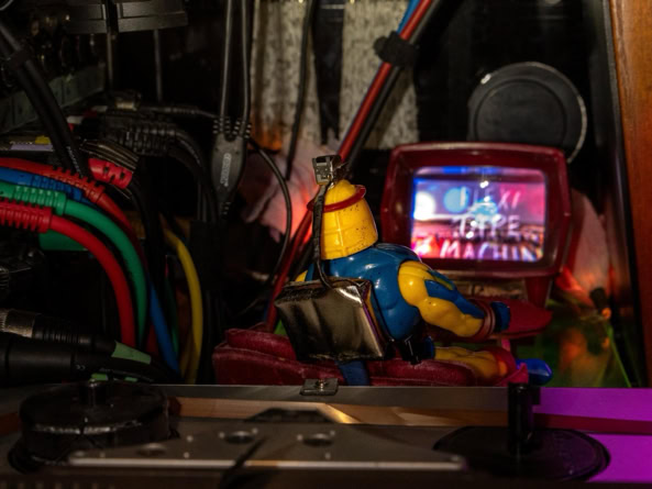 Man betritt diesen Ort – nicht richtig Bühne, nicht richtig Installation, eher so etwas wie der transparente Bauch eines Raumschiffs, neonbunt aus den 90er-Jahren. Plexiglas, Kabel, Magnetband. Die Maschine: ein widerspenstiger Block aus Nostalgie und Zukunft.