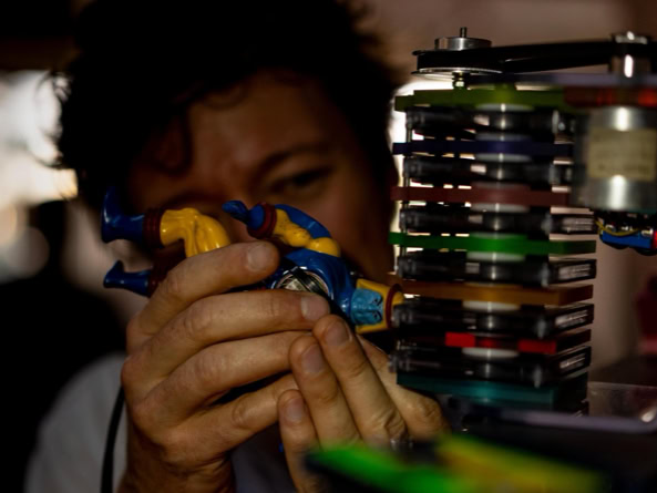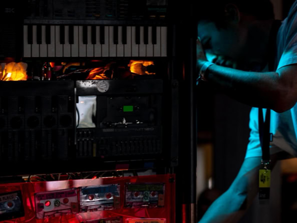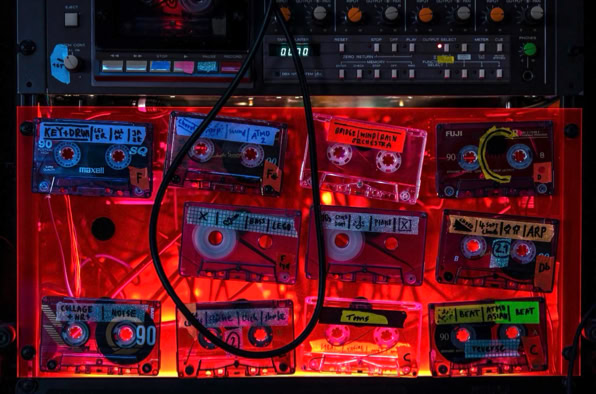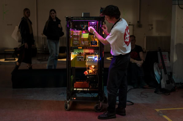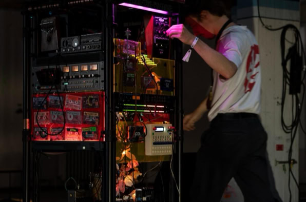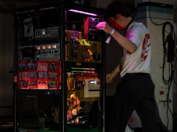 You enter this place – not quite a stage, not quite an installation, more like the transparent belly of a spaceship, neon-coloured from the 1990s. Plexiglass, cables, magnetic tape. The machine: a rebellious block of nostalgia and future. Johannes Till is not just a musician, he is something like a machine interpreter. He feeds it, he hesitates, he lets the thing stumble and sing. Man and machine in co-dependence. Tape is running. Real tape. Cassettes crackle, reels purr. No laptop, no endless playlist from the cloud. Instead: this warm, woolly waft that sounds like an embrace from something long lost. In the end, you don‘t know if this was a concert? An installation? A manifesto against digitalisation? Or simply proof that beauty sometimes lies in noise.